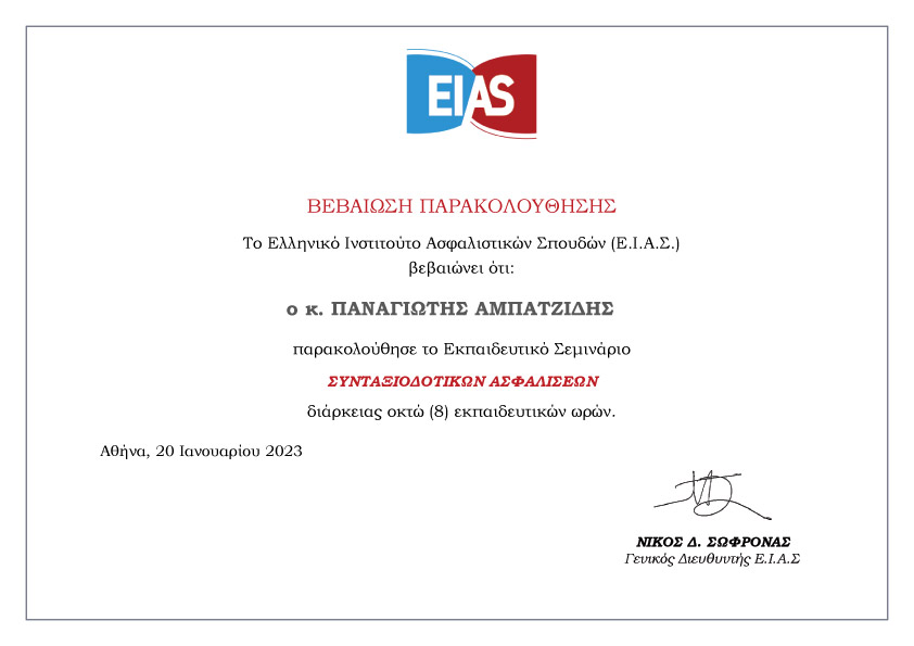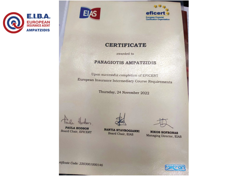 Πιστοποιητικό αποφοίτων του διεθνούς Προγράμματος Μετεκπαίδευσης SQF3 European InsuranceIntermediary, που το Ελληνικο Ινστιτούτο Ασφαλιστικών Σπουδών διεξηγαγε σε επιστημονική συνεργασία με τον Ευρωπαϊκό Οργανισμό Ασφαλιστικών και Χρηματοοικονομικών Πιστοποιήσεων EFICERT.